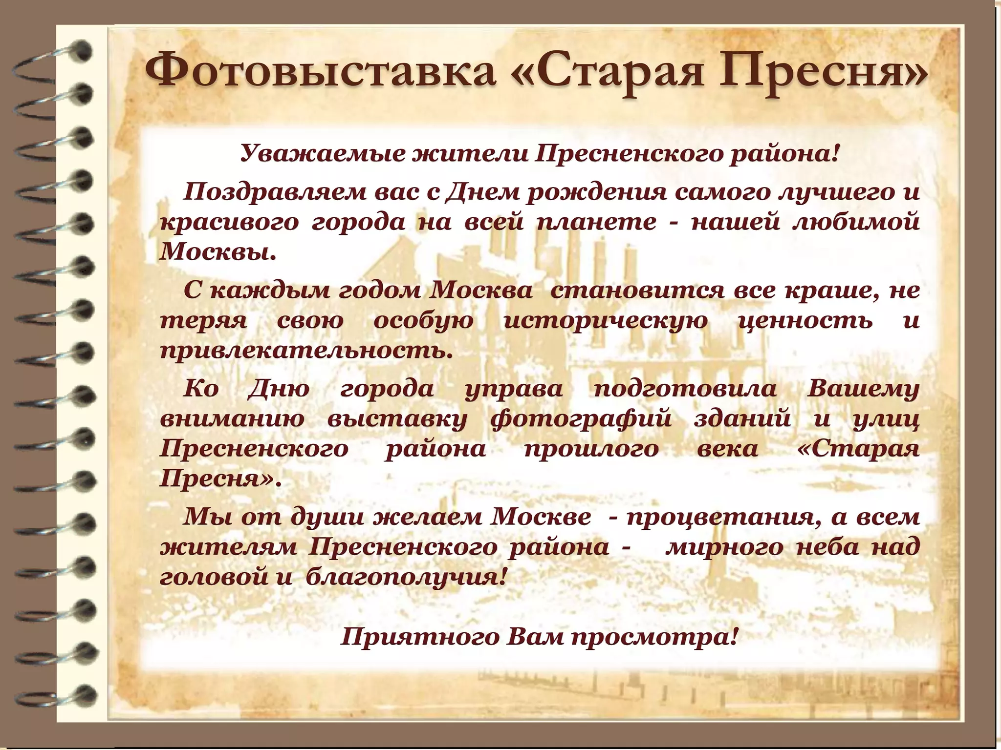 В документе анонсируется фотовыставка «старая пресня», посвященная историческим зданиям и улицам пресненского района Москвы. Выставка приурочена ко дню рождения города и подчеркивает его красоту и историческую ценность. Организаторы желают москвичам благополучия и приятного просмотра.