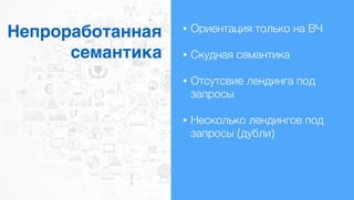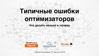 Документ описывает типичные ошибки оптимизаторов в SEO, включая проблемы с семантикой, дублирующие лендинги и недостаточный анализ конкурентов. Упоминаются важные элементы оптимизации, такие как заголовки, тексты и социальные сети. Также отмечается необходимость учета коммерческих факторов и качества контента на сайте.
