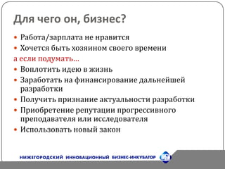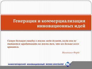 Документ обсуждает важность генерации и коммерциализации инновационных идей, призывая людей зарабатывать на жизнь тем, что им действительно нравится. Он рассматривает основные ошибки, которые можно допустить при организации бизнеса, а также определяет инновации как движущую силу предпринимательства. Кроме того, внимание уделяется составлению бизнес-плана, который необходим для привлечения партнеров и финансирования.