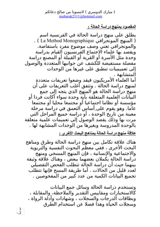 تتناول هذه الوثيقة منهج الحالة الدراسية (la method monographique) الذي يستخدم لدراسة موضوعات معينة بتفصيل، مثل المجتمع أو القبيلة. يركز المنهج على تحليل الظواهر والعلاقات المعقدة في الوحدات المختلفة، ويجمع بيانات متنوعة من عدة طرق ووسائل. تهدف الدراسة إلى الوصول إلى فهم أعمق وتحليل دقيق للموضوع المدروس مع الأخذ في الاعتبار العوامل المؤثرة.