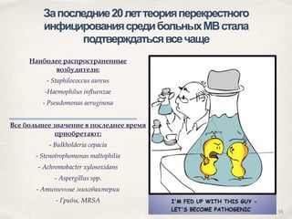 Документ обсуждает микробиологические диагнозы и меры профилактики инфекций у больных муковисцидозом, акцентируя внимание на различных возбудителях и методах их диагностики. Особое внимание уделяется важности адекватной антибиотикотерапии и мерам предосторожности в клинической практике для предотвращения перекрестного инфицирования. Также рассматриваются эффективные способы диагностики и важность соблюдения рекомендаций для уменьшения риска инфекции.