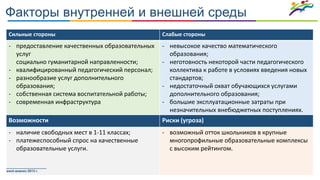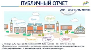 Документ представляет публичный отчет Центра образования № 1953 за 2014-2015 учебный год, в котором описываются сильные и слабые стороны учреждения, а также возможности и риски его функционирования. Основные достижения включают качественные образовательные услуги и квалифицированный педагогический состав, в то время как проблемы включают низкое качество математического образования и высокие эксплуатационные затраты. В отчете также представлена информация о результатах аттестации учащихся, бюджетировании и программах энергосбережения.