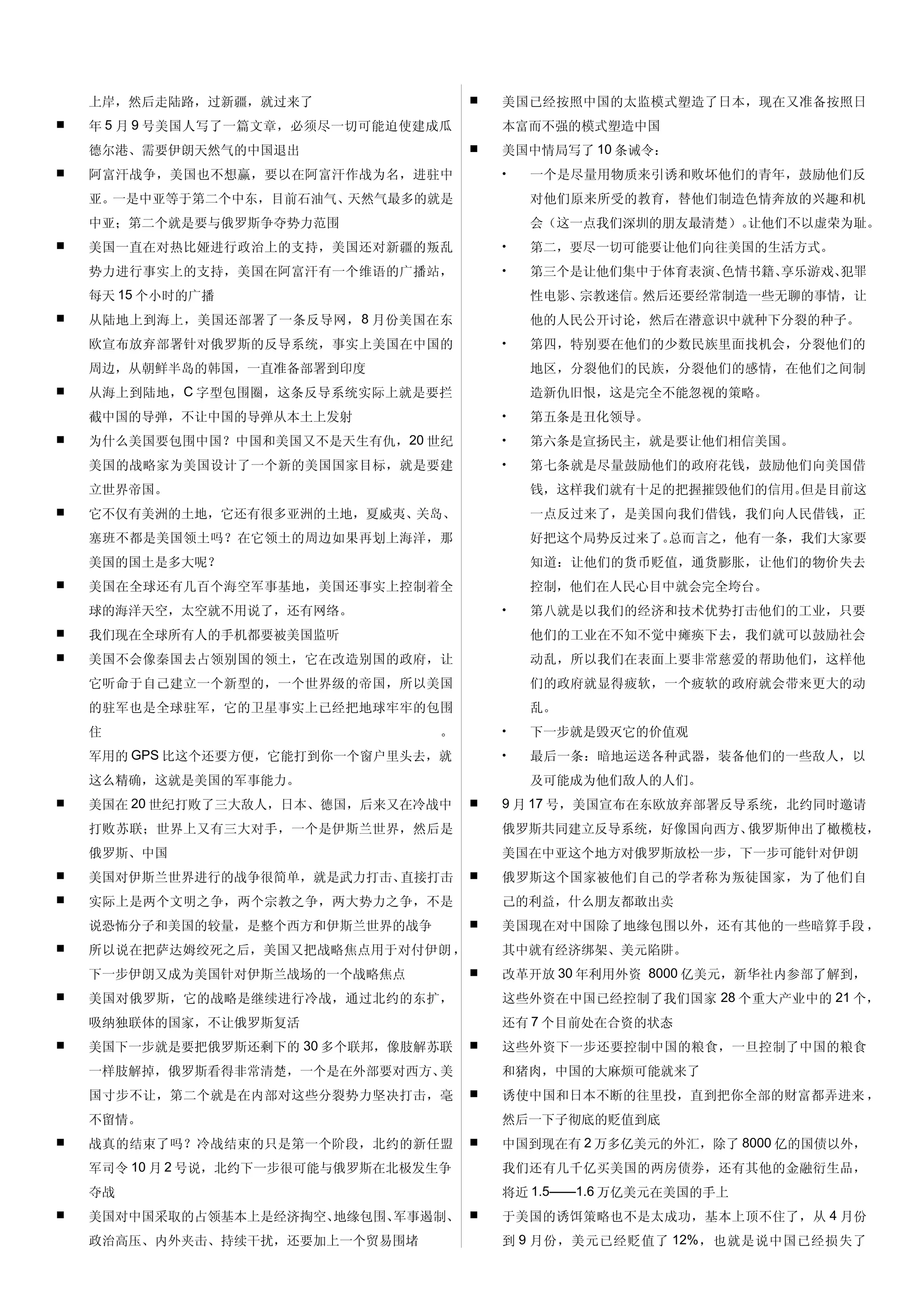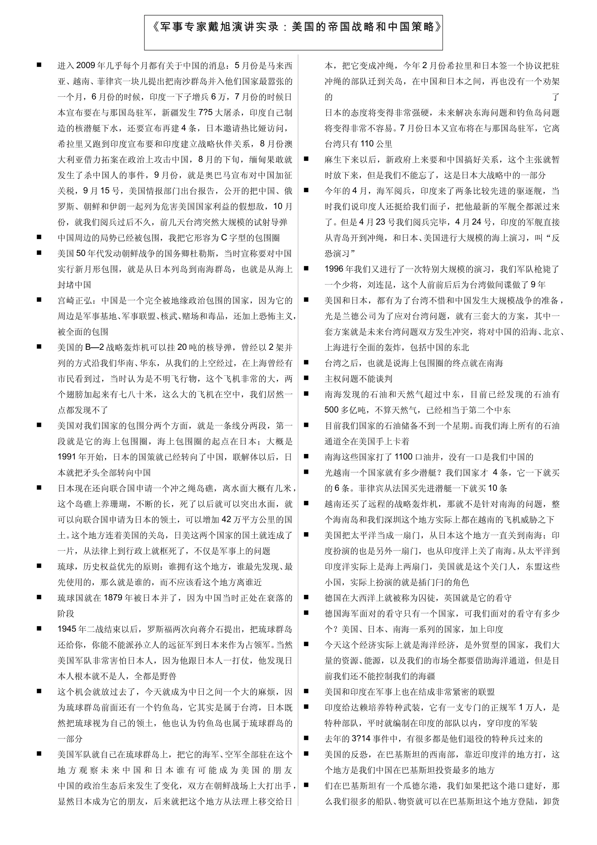 文档讨论了美国对中国的包围与遏制战略,包括军事、经济和地缘政治方面的举措。强调了中国面临的多重压力,比如周边国家的军事扩张以及美国的反导系统部署。指出,美国通过经济手段试图削弱中国的影响力,并描绘了未来可能的冲突局势。