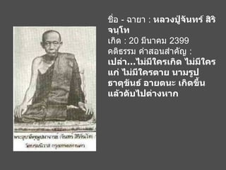 ชื่อ - ฉายา : หลวงปู่จันทร์ สิริจนฺโท เกิด : 20 มีนาคม 2399 คติธรรม คำสอนสำคัญ : เปล่า…ไม่มีใครเกิด ไม่มีใครแก่ ไม่มีใครตาย นามรูป ธาตุขันธ์ อายตนะ เกิดขึ้นแล้วดับไปต่างหาก - 3.