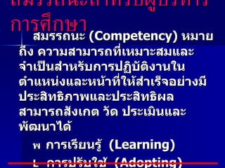 สมรรถนะสำหรับผู้บริหารการศึกษา สมรรถนะ ( Competency) หมายถึง ความสามารถที่เหมาะสมและจำเป็นสำหรับการปฏิบัติงานในตำแหน่งและหน้าที่ให้สำเร็จอย่างมีประสิทธิภาพและประสิทธิผล สามารถสังเกต วัด ประเมินและพัฒนาได้ การเรียนรู้ ( Learning) การปรับใช้ ( Adopting) การปฏิบัติได้อย่างเหมาะสม ( Performing ) การนำ ( Leading ) - 2.