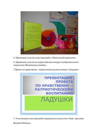 Группа «улыбка» достигла успехов в различных мероприятиях, включая выставки, конкурсы и проекты, направленные на патриотическое воспитание. Участники заняли призовые места на всероссийских конкурсах и приняли участие в международной олимпиаде. Также были реализованы проекты, связанные с правильным питанием и защитой ценностей материнства.