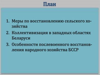 Документ обсуждает меры по восстановлению сельского хозяйства в БССР после Второй мировой войны, включая коллективизацию и помощь от государства. Восстановление прошло медленно из-за нехватки ресурсов и труда, а также предпочтения промышленности в условиях Холодной войны. К середине 1950-х годов сельское хозяйство начало стабилизироваться благодаря применению экономических методов управления.