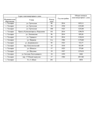 Документ содержит информацию о многоквартирных домах в городе Таганрог, включая адреса, годы постройки и общую площадь. Представленные данные охватывают здания, построенные с 1918 по 2014 год. В общей сложности перечислено 10 адресов с указанием их площадей.