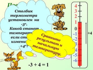 Документ представляет собой учебный материал для 6 класса, посвященный повторению основ математики, включая работу с координатной прямой и термометром. В нем рассматриваются примеры сложения положительных и отрицательных чисел, а также важные математические выводы о влиянии этих операций на сумму. В конце документа указаны задания для самостоятельной работы и домашние задания.