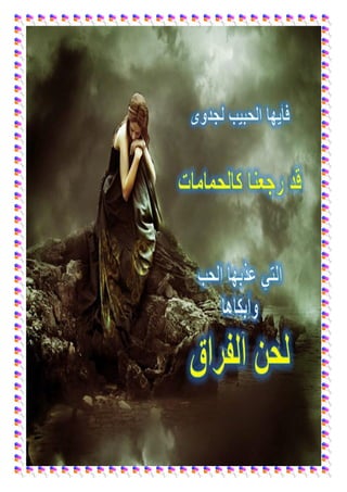 ألقيت مواعد لقائي بتوديعي مكان اللقاء وكتبت عنده كان محطات عشق لما كتبت كان المداد من الدمع القيت للرياح كل الأوراق وترافقت مع الطريق بأرض كل الشوارع لا أشكو . . . سوى شوقي إليك فأيها الحبيب لجدوى سيقتلني الانتظار ستحطمني الذكريات ستميطني الدمعات أسافر في فضاء الحلم القمر يغني سنفونيته لحن الفراق الساهرات النجوم اقتربت سمعت هذه النغمات يسكت الصوت خرجت من سماء الضوء أجد نفسي كنت هائما في طريق الحلم راحلة روحي عبر الفضاء تبحث عن لغة كيف يكون الحب ؟ روحي تجيء تعالي يا منا في النفس يا ... من أين الدموع تجيء الدرب عبر القرون الحزينة يبدو خاليا لولا الذكريات والحب المحنى بالدموع لحسبت أني آدم هذا الزمان تابعت طريقي أنشد هذه الكلمات أحس أنني في الحياة روح غريب أيامي أسم أقاسي أنواع العذاب يا من أخد حياتي مني وهرب وترك قلبي من الأشواق ذاب ليالي مع الماضي والذكرى عتاب وقلبي جراح ودنياي سراب أخشى أن أسير في دربي وحيدا فمشوار طريقي بدونك خراب أسير بلا حيرة كأني الحبيب الذي عرف الدرب نحو الحبيبة أسير بلا حيرة على أرض كل الشوارع أهيم في الطرقات المحلات أحاول أن أنسى الماضي لكن تقاطعني الذكريات وقفت أبكي هل ظلت الدموع لم تصر وديانا أيا أحزان هذا العالم أما عرفت طريقك غير سواي يا حبا تفتح داخل الصدور أما سقيتك بدمعي لكن لما الذبول فأيها الحبيب لجدوى قد رجعنا كالحمامات التي عذبها الحب وأبكاها لحن الفراق