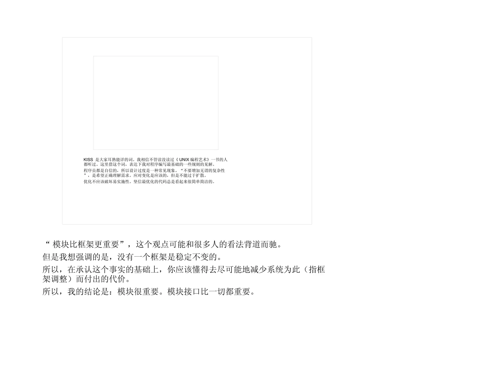 所以,在承认这个事实的基础上,你应该懂得去尽可能地减少系统为此(指框架调整)而付出的代价。 所以,我的结论是:模块很重要。模块接口比一切都重要。