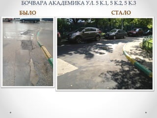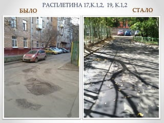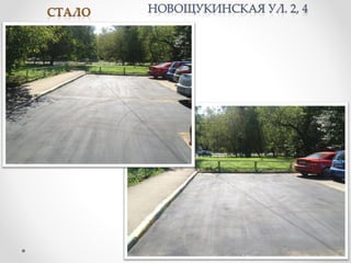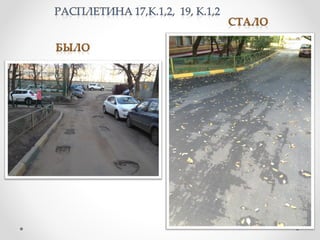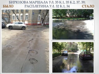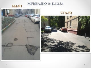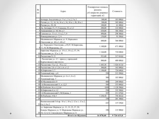 Документ содержит информацию о ремонте асфальтобетонного покрытия и благоустройстве дворовых территорий в Москве в рамках программы «жилище». Указаны адреса, планируемая площадь, затраты и виды работ для каждого объекта. Общая стоимость работ составляет 9 726 633,0 тыс. рублей.