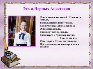 Документ представляет читательский дневник ученицы 3 'А' класса, в котором она делится впечатлениями о прочитанных книгах шведских писателей, таких как Астрид Линдгрен и Туве Янссон. Учащаяся описывает своих любимых персонажей, таких как Карлсон и Пеппи Длинный Чулок, а также иллюстрирует свои работы и участвует в конкурсах. В заключение, она предлагает кроссворды и делится интересными фактами о прочитанных произведениях.