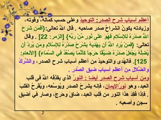 يتناول هذا المستند شرح أسباب انشراح الصدر وأهمية التوحيد في الإيمان. يناقش أيضًا كيف أن ضيق الصدر مرتبط بالغفلة عن الله وعواقبها على النفس. ويبرز قيمة محبة الله وأثرها الإيجابي على حياة العبد.