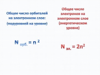 Документ описывает состояние электрона в атоме с точки зрения основных принципов квантовой механики, выделяя его двойственную природу как частицы и волны. Обсуждаются модель электронного облака, вероятностные характеристики нахождения электрона, а также квантовые числа, определяющие энергию и форму орбиталей. Также упоминается образование возбужденных состояний атома при переходе электронов между уровнями энергии.