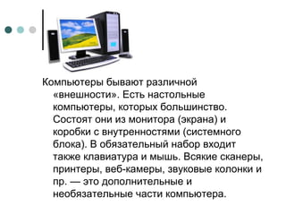 Документ описывает различные виды компьютеров, включая настольные, мини-настольные, ноутбуки и планшеты, а также их ключевые компоненты. Основное внимание уделяется аппаратной реализации компьютеров, в том числе системным блокам, материнским платам и их функциональным составляющим. Также рассматриваются интерфейсы и порты для подключения периферийных устройств и характеристики системной шины.