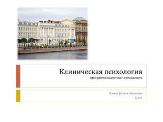 Документ описывает программу подготовки специалистов в области клинической психологии, которая включает шестилетнее образование с практической подготовкой и возможностью специализации по шести направлениям. Программа сочетает научное и прикладное обучение, что обеспечивает выпускникам высокую конкурентоспособность на рынке труда и востребованность профессий психологов. Указаны также основные преподаватели программы и их достижения, а также организации-партнеры для практической подготовки студентов.