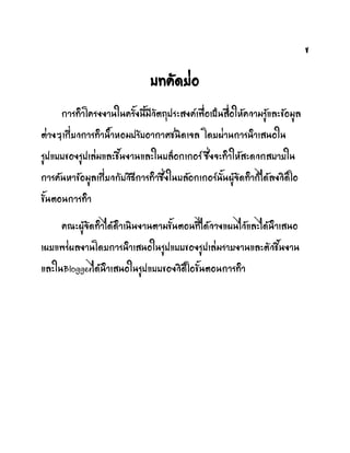 สารบัร บทคัดย่อ……………………………………………………………………………………………………ก กิตติกรรมประกาศ……………………………………………………………………………………..ข สารบัร……………………………………………………………………………………………………….ค บทที่ 1.บทภ้า……………………………………………………………………………………………………..1 ที่มาและความส้าคัรของโครงงาภ……………………………………………………………..1 วัตถุประสงคย………………………………………………………………………………………………1 ขอบเขตของการศึกษา……………………………………………………………………………….2 ผลที่คาดว่าจะได้รับ…………………………………………………………………………………….2 2.เอกสารที่เกี่ยวข้อง………………………………………………………………………………..3-4
