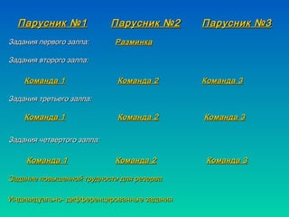 Документ представляет собой план заданий для команд по теме электролитической диссоциации и реакции веществ. Включены различные уровни сложности, а также задания на сообразительность и анализ. Каждое задание связано с химическими реакциями, и определяются конкретные задачи для команд и индивидуальные расчеты.