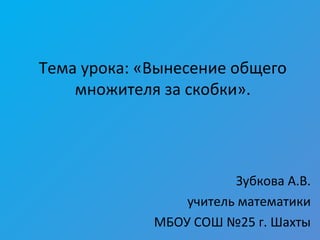 Документ представляет собой план урока по математике на тему 'вынесение общего множителя за скобки', включающий примеры задач и домашнее задание. Основное внимание уделяется формированию навыков поиска общего множителя и распознаванию многочленов. В конце документа приводится форма обратной связи для оценки урока учащимися.