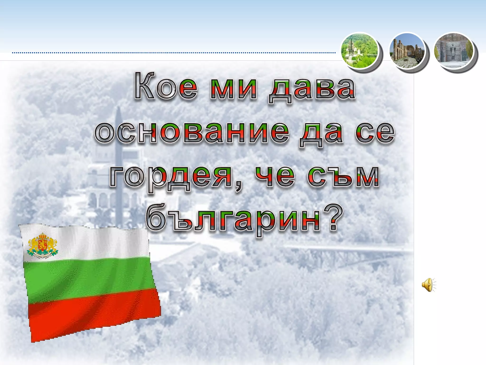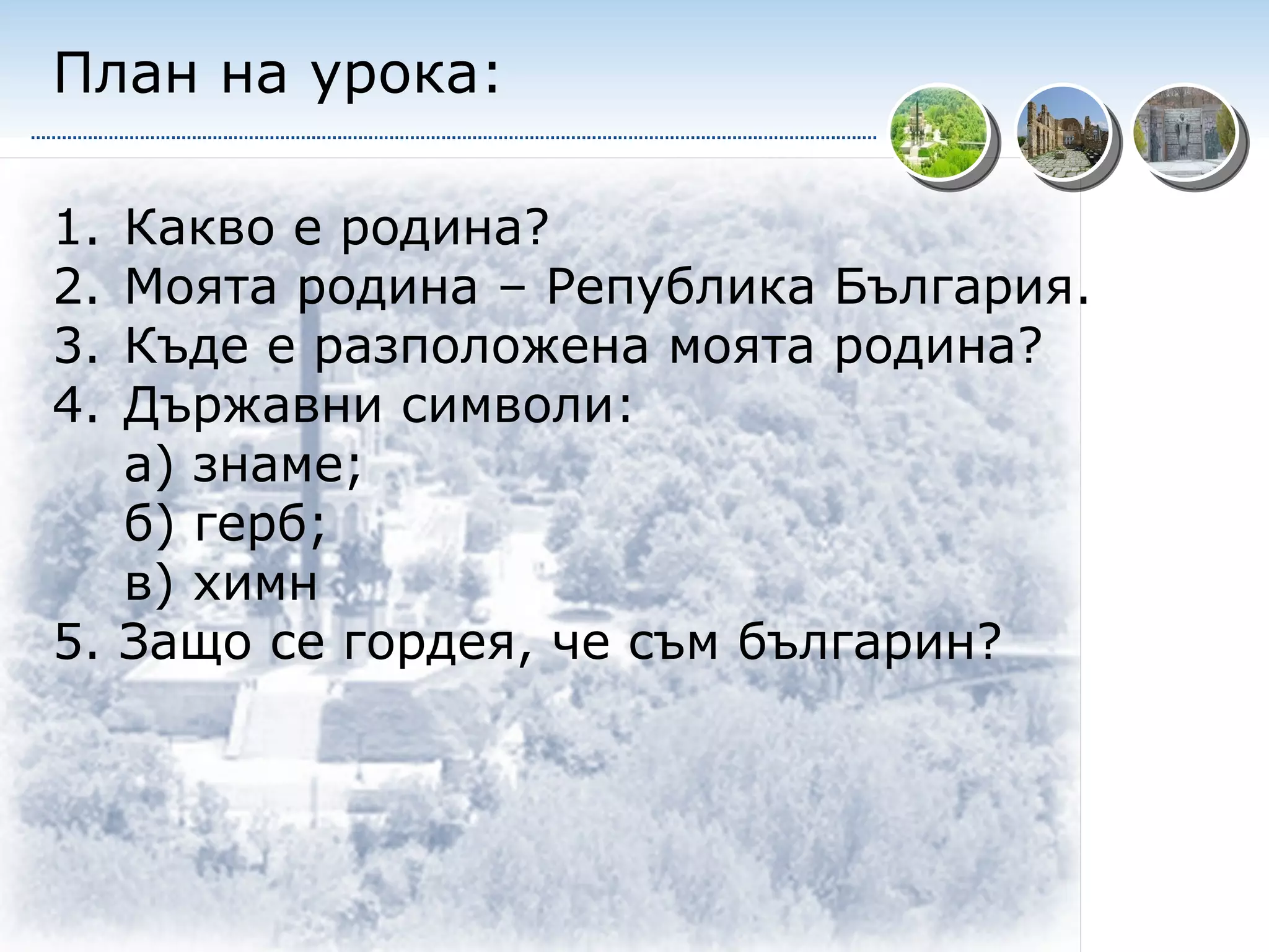 План на урока:Какво е родина? Моята родина – Република България. Къде е разположена моята родина? Държавни символи: а) знаме; б) герб; в) химн 5. Защо се гордея, че съм българин?