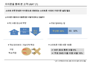 아이폰을 통해 본고객 U&A* (1)스마트 마켓 탄생과 아이폰으로 대변되는 스마트폰 시대의 기대기준 설정 필요아이폰 이용자의 이용환경은 어떻게 변하고 있을까? ● PC 사용감소세 뚜렷 ● 주로 접속하는 망 유사 3G 32% 감소 54% 무선랜 68% 증가7% 39% ● 스마트폰 이용비중 100중 ● 댁내 와이파이가능지역 확대가정 84% 16% 학교/직장 78% 22% ☞ WiFi음성통화 비율 8% ☞ 무료 SMS 어플이용 비율 18%* [KT, 마케팅인사이트 공동 리서치 결과 2010.3월]