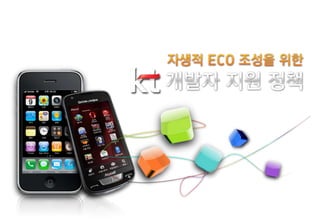 ECONOVATION 사업 추진전략우호적 스마트폰 개발자 그룹의 체계적/개방적 양성을 통해 고품질의 유효 애플리케이션 개발 활성화Data Explosion 촉진과 고객 리텐션 강화 등 스마트폰 시장 확대와 앱 개발/유통의 선순환 구조 마련스마트폰데이터 사업 전략ECONOVATION 사업 추진스마트폰Open ECO-System강화 자생적 Open ECO 형성으로 우호적 개발자 육성Step 1 On & Off 개발자 지원 환경구축KT Network & Platform 개방 피처폰 중심의 폐쇄적 개발구조를 개방형 생태계로 전환 및 중소 개발사와의 협력체계 구성Step 2피처폰 기반 무선 인터넷서비스 역량을 스마트폰중심으로 조기 전환 애플리케이션 개발 활성화로 스마트폰 기반 모바일 사업 활성화, 퍼블리싱 등의 부가BM 발굴Step 3