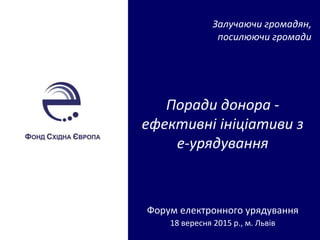 донора - ефективні ініціативи з е-урядування Форум електронного урядування 18 вересня 2015 р., м. Львів