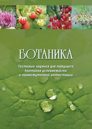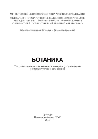 Документ представляет собой учебное пособие по тестовым заданиям по ботанике, предназначенное для студентов аграрного университета, с целью контроля успеваемости и подготовки к промежуточной аттестации. Содержит задания по различным темам ботаники, включая анатомию, морфологию и систематику растений, а также рекомендации для их использования в образовательном процессе. Пособие одобрено кафедрой лесоведения и рекомендовано к изданию.