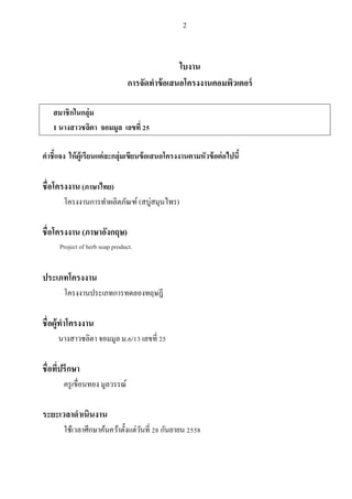 เลขที่ 25 คาชี้แจง ให้ผู้เรียนแต่ละกลุ่มเขียนข้อเสนอโครงงานตามหัวข้อต่อไปนี้ ชื่อโครงงาน (ภาษาไทย) โครงงานการทาผลิตภัณฑ์ (สบู่สมุนไพร) ชื่อโครงงาน (ภาษาอังกฤษ) Project of herb soap product. ประเภทโครงงาน โครงงานประเภทการทดลองทฤษฎี ชื่อผู้ทาโครงงาน นางสาวชลิตา จอมมูล ม.6/13 เลขที่ 25 ชื่อที่ปรึกษา ครูเขื่อนทอง มูลวรรณ์ ระยะเวลาดาเนินงาน ใช้เวลาศึกษาค้นคว้าตั้งแต่วันที่ 28 กันยายน 2558