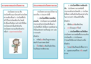 ประโยคขึ้นไป เข้าไว้ในประโยคเดียวกัน โดยมี คาเชื่อมหรือสันธานทาหน้าที่เชื่อม ประโยคเหล่านั้นเข้าด้วยกัน ประโยคความรวมเรียกอีกอย่าง หนึ่งว่า อเนกกรรถประโยค ประโยคความรวมแบ่งใจความ ออกเป็น 4 ประเภท ดังนี้ 1. ประโยคที่มีความคล้อย ตามกัน ประโยคความรวมชนิดนี้ ประกอบด้วยประโยคเล็กตั้งแต่ 2 ประโยคขึ้นไป มีเนื้ อความคล้อยตาม กันในแง่ของความเป็นอยู่ เวลา และ การกระทา ตัวอย่าง • ทรัพย์และสินเป็นลูกชายของ พ่อค้าร้านสรรพพาณิชย์ • ทั้งทรัพย์และสินเป็นนักเรียน โรงเรียนอาทรพิทยาคม 2. ประโยคที่มีความขัดแย้ง กัน ประโยคความรวมชนิดนี้ ประกอบด้วยประโยคเล็ก 2 ประโยค มีเนื้ อความที่แย้งกันหรือแตกต่างกัน ในการกระทา หรือผลที่เกิดขึ้น ตัวอย่าง พี่ตีฆ้องแต่น้องตีตะโพน กว่าถั่วจะสุกงาก็ไหม้ 3. ประโยคที่มีความให้เลือก ประโยคความรวมชนิดนี้ ประกอบด้วย ประโยคเล็ก 2 ประโยคและ กาหนดให้เลือกอย่างใดอย่างหนึ่ง ตัวอย่าง ไม่เธอก็ฉันเป็นคนไปซื้ออาหาร • คุณชอบดนตรีไทย หรือ ดนตรี สากล ความหมายของประโยคความ ประเภทของประโยคความรวม
