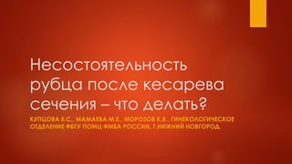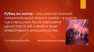Документ рассматривает проблемы несостоятельности рубца на матке после кесарева сечения, включая частоту таких операций и методы оценки состояния рубца. Основными методами оценки являются гистероскопия и МРТ, которые помогают в диагностике и планировании лечения. Рекомендуемым методом лечения является реконструктивная метропластика для восстановления целостности матки.