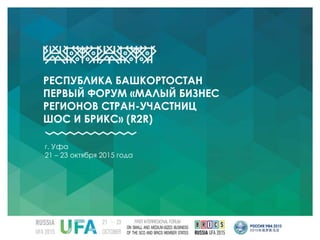 Форум «Малый бизнес регионов стран-участниц ШОС и БРИКС», проходивший в Уфе с 21 по 23 октября 2015 года, был направлен на создание благоприятных условий для развития малого предпринимательства и укрепление межрегиональных связей. Основные цели форума включали развитие инновационной инфраструктуры, привлечение инвестиций и формирование механизмов поддержки малых компаний. В ходе мероприятия обсуждались лучшие практики законодательной поддержки и возможности сотрудничества в сфере туризма и IT-технологий.