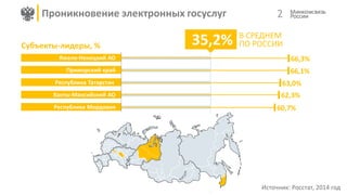 Документ описывает взаимодействие финансовых рынков и электронного правительства в России, с акцентом на рост использования электронных госуслуг. В 2015 году зарегистрировано 18 миллионов пользователей на едином портале госуслуг, свидетельствующее о его популярности. Также приводятся данные о лидерстве и аутсайдерстве субъектов РФ по уровню проникновения электронных госуслуг.