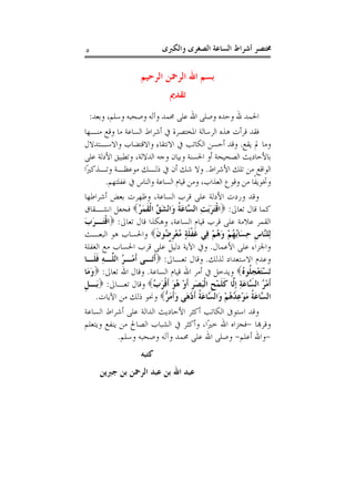 ﺃﺷﺮﺍﻁ ﳐﺘﺼﺮ٥٥ ﺍﻟﻔﻬﺮﺱ ﺗﻘﺪﱘ.......................................................٥ ﺍﳌﻘﺪﻣﺔ......................................................٦ ﺍﻟﺴﺎﻋﺔ ﺃﺷﺮﺍﻁ...............................................٧ ﺍﻟﺼﻐﺮﻯ ﺍﻟﺴﺎﻋﺔ ﺃﺷﺮﺍﻁ......................................٩ ١-ﺍﻟﻨﱯ ﺑﻌﺜﺔ:...................................٩ ٢-ﺍﻟﻨﱯ ﻣﻮﺕ:.................................٩ ٣-ﺍﳌﻘﺪﺱ ﺑﻴﺖ ﻓﺘﺢ:...............................٩ ٤-ﻋﻤﻮﺍﺱ ﻃﺎﻋﻮﻥ:................................٩ ٥-ﺍﻟﺼﺪﻗﺔ ﻋﻦ ﻭﺍﻻﺳﺘﻐﻨﺎﺀ ﺍﳌﺎﻝ ﺍﺳﺘﻔﺎﺿﺔ:...........١٠ ٦-ﺍﻟﻔﱳ ﻇﻬﻮﺭ:...................................١٠ ٧-ﺍﻟﻨﺒﻮﺓ ﱢﻲﻣﺪﻋ ﻇﻬﻮﺭ:............................١٢ ٨-ﺍﻷﻣﻦ ﺍﻧﺘﺸﺎﺭ:..................................١٢ ٩-ﺑﺎﳊﺠﺎﺯ ﻧﺎﺭ ﻇﻬﻮﺭ:.............................١٢ ١٠-ﺍﻟﺘﺮﻙ ﻗﺘﺎﻝ:..................................١٣ ١١-ﺍﻟﻌﺠﻢ ﻗﺘﺎﻝ:.................................١٣ ١٢-ﺍﻷﻣﺎﻧﺔ ﺿﻴﺎﻉ:................................١٣ ١٣-ﺍﳉﻬﻞ ﻭﻇﻬﻮﺭ ﺍﻟﻌﻠﻢ ﻗﺒﺾ:....................١٣
