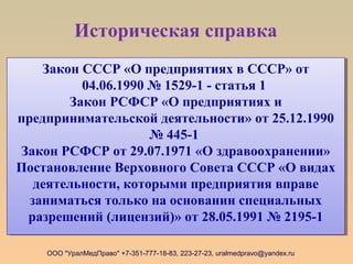 Документ охватывает лицензирование медицинской деятельности в России, включая основные законодательные акты и требования для получения лицензий. Он описывает функции лицензионных органов и основополагающие понятия, такие как соискатель лицензии и лицензиат. Включены также детали о нормативно-правовой базе и специфических законах, регулирующих различные виды медицинских услуг.