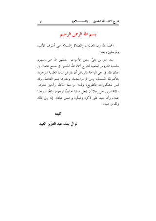 ﺷﺮﺡ) ..ﺍﻟﺴــﻼﻡ(٥ ﺍﻟﺮﺣﻴﻢ ﺍﻟﺮﲪﻦ ﺍﷲ ﺑﺴﻢ ﺍﻷﻧﺒﻴﺎﺀ ﺃﺷﺮﻑ ﻋﻠﻰ ﻭﺍﻟﺴﻼﻡ ﻭﺍﻟﺼﻼﺓ ،ﺍﻟﻌﺎﳌﲔ ﺭﺏ ﷲ ﺍﳊﻤﺪ ﻭﺑﻌﺪ ﻭﺍﳌﺮﺳﻠﲔ: ﳛﻀﺮﻥ ﳑﻦ ﺍﷲ ﺣﻔﻈﻬﻦ ﺍﻷﺧﻮﺍﺕ ﺑﻌﺾ ﻲﻋﻠ ﺍﻗﺘﺮﺣﻦ ﻓﻘﺪ ﺑﻦ ﻋﺜﻤﺎﻥ ﺟﺎﻣﻊ ﰲ ﺍﳊﺴﲎ ﺍﷲ ﺃﲰﺎﺀ ﻟﺸﺮﺡ ﺍﻟﻌﻠﻤﻴﺔ ﺍﻟﺪﺭﻭﺱ ﺳﻠﺴﻠﺔ ﻋﻔﺎﻥﺍﻟﻌ ﺍﳌﺎﺩﺓ ﻳﻔﺮﻏﻦ ﺃﻥ ﺑﺎﻟﺮﻳﺎﺽ ﺍﻟﻮﺍﺣﺔ ﺣﻲ ﰲﺍﳌﻮﺟﻮﺩﺓ ﻠﻤﻴﺔ ﻭﻗﺪ ،ﺍﻟﻔﺎﺋﺪﺓ ﻟﺘﻌﻢ ﻭﻧﺸﺮﻫﺎ ،ﻣﺮﺍﺟﻌﺘﻬﺎ ﰒ ﻭﻣﻦ ،ﺍﳌﺴﺠﻠﺔ ﺑﺎﻷﺷﺮﻃﺔ ﻧﺸﺮﻫﺎ ﻭﺃﺟﻴﺰ ،ﺍﳌﺎﺩﺓ ﻣﺮﺍﺟﻌﺔ ﻭﲤﺖ ،ﺑﺎﻟﺘﻔﺮﻳﻎ ﻣﺸﻜﻮﺭﺍﺕ ﻗﻤﻦ، ﻟﺪﺭﺟﺘﻨﺎ ﺎﻌﺭﺍﻓ ،ﻟﻮﺟﻬﻪ ﺎﺼﺧﺎﻟ ﻋﻤﻠﻨﺎ ﳚﻌﻞ ﺃﻥ ﻭﻋﻼ ﺟﻞ ﺍﳌﻮﱃ ﺳﺎﺋﻠﺔ ﺫﻟﻚ ﻭﱄ ﺇﻧﻪ ،ﻋﺒﺎﺩﺗﻪ ﻭﺣﺴﻦ ﻭﺷﻜﺮﻩ ﺫﻛﺮﻩ ﻋﻠﻰ ﻳﻌﻴﻨﻨﺎ ﻭﺃﻥ ،ﻋﻨﺪﻩ ﻭﺍﻟﻘﺎﺩﻋﻠﻴﻪ ﺭ. ﻛﺘﺒﺘﻪ ﺍﻟﻌﻴﺪ ﺍﻟﻌﺰﻳﺰ ﻋﺒﺪ ﺑﻨﺖ ﻧﻮﺍﻝ