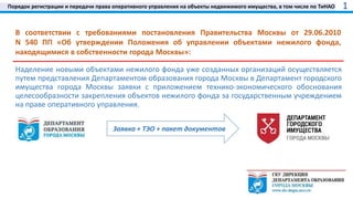 Документ описывает порядок регистрации и передачи права оперативного управления на объекты недвижимого имущества в Москве, включая необходимый пакет документов и технико-экономическое обоснование. Указаны этапы процесса, начиная с подачи заявки и заканчивая регистрацией акта приема-передачи. Также рассматриваются условия использования и ответственность учреждений за принятые объекты.