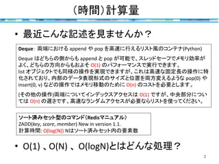 、O(N) 、 O(logN)とはどんな処理? ソート済みセット型のコマンド(Redisマニュアル) ZADD(key, score, member) New in version 1.1. 計算時間: O(log(N)) Nはソート済みセット内の要素数 Deque: 両端における append や pop を高速に行えるリスト風のコンテナ(Python) Deque はどちらの側からも append と pop が可能で、スレッドセーフでメモリ効率が よく、どちらの方向からもおよそ O(1) のパフォーマンスで実行できます。 list オブジェクトでも同様の操作を実現できますが、これは高速な固定長の操作に特 化されており、内部のデータ表現形式のサイズと位置を両方変えるような pop(0) や insert(0, v) などの操作ではメモリ移動のために O(n) のコストを必要とします。 (その他の操作)両端についてインデックスアクセスは O(1) ですが、中央部分につい ては O(n) の遅さです。高速なランダムアクセスが必要ならリストを使ってください。