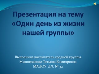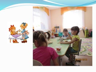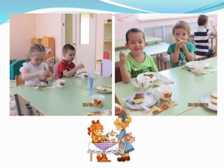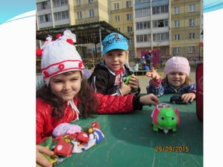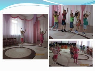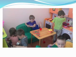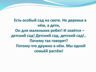 Документ описывает жизнь и занятия детей в детском саду, подчеркивая важность игр, общения и отдыха. Воспитатель Татьяна Камияровна рассказывает о различных активностях, включая зарядку, утренние завтраки и прогулки на свежем воздухе. Дети выражают свою любовь к детскому саду и ожидание встреч с родителями.