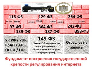 Документ анализирует государственное регулирование интернета в России, выделяя негативные тренды, связанные с ужесточением законодательства и расширением блокировок. Принятые и рассматриваемые законопроекты создают новые ограничения для пользователей и нагрузку на интернет-бизнес, в то время как инициатива по улучшению прав и свобод в сети находится на низком уровне. Обсуждаются также перспективы декриминализации файлового обмена и продвижение свободных лицензий.