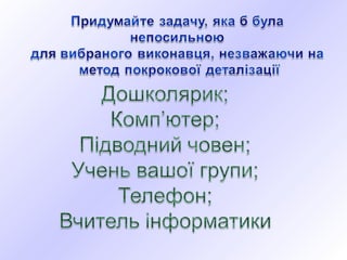 Якщо виконавець незнає, як виконати поставлене завдання, необхідно розкласти завдання на такі підзадачі, які є