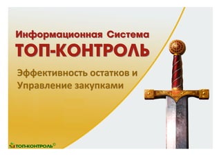 Документ описывает систему управления остатками и закупками компании 'Топ-Контроль', предлагающую модульные решения для оптимизации бизнес-процессов. Система включает инструменты для контроля складских запасов, анализа эффективности и формирования заказов поставщикам. Основные преимущества заключаются в индивидуальном подходе к каждому клиенту, высокой скорости установки и отсутствии периодических платежей.