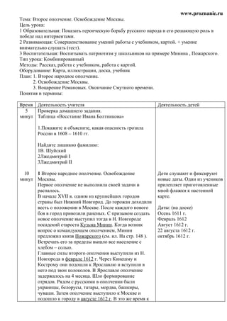 Документ описывает урок по теме второго народного ополчения и освобождения Москвы, акцентируя внимание на героической борьбе русского народа и роли Минина и Пожарского. В уроке используются различные методы обучения, включая рассказ и работу с учебником и картой. Учащиеся проверяют свои знания через тесты и учебные задания, связанный с историческими событиями и личностями этого периода.