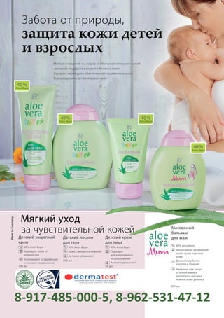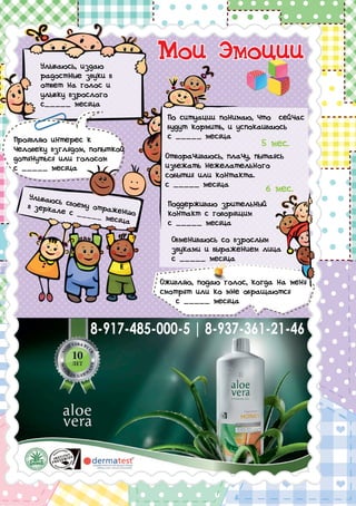 Документ представляет собой руководство по уходу за чувствительной кожей, включая продукты с содержанием алоэ вера и экстракта календулы, рекомендованные как для детей, так и для взрослых. Также содержит советы для родителей о том, как зафиксировать перемены в развитии ребенка и ухаживать за новорожденными, включая ритуалы сна и уход за кожей после кесарева сечения. В документе указаны контакты медицинских специалистов и реклама различных товаров для здоровья.