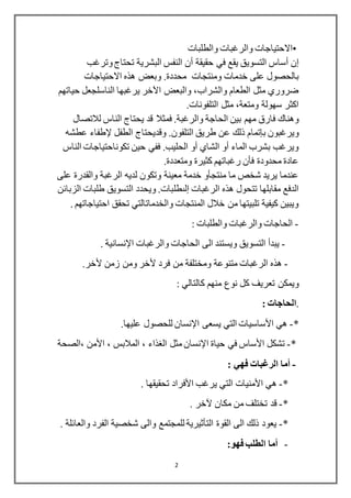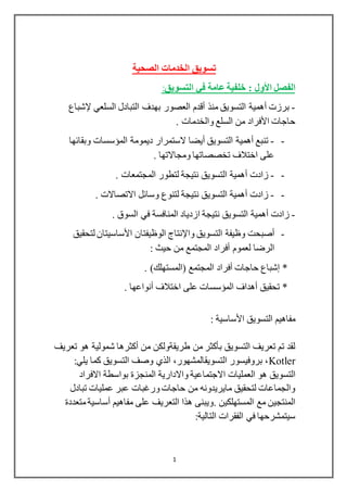 تتناول الوثيقة أهمية التسويق في تلبية احتياجات الأفراد والمؤسسات، حيث يُعتبر التسويق عنصراً أساسياً في الاستدامة والابتكار. يتم تعريف التسويق كعمليات اجتماعية وإدارية تهدف لتبادل المنتجات والخدمات التي تلبي رغبات المستهلكين. كما تتطرق الوثيقة إلى مفاهيم أساسية في التسويق مثل الحاجات والرغبات والطلبات، وكيف تتحول الرغبات إلى طلبات قابلة للتحقيق.
