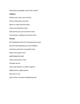на сцени су деца обучена у ношње, седе, играју се зује. Улази ученик – Свети Сава. У