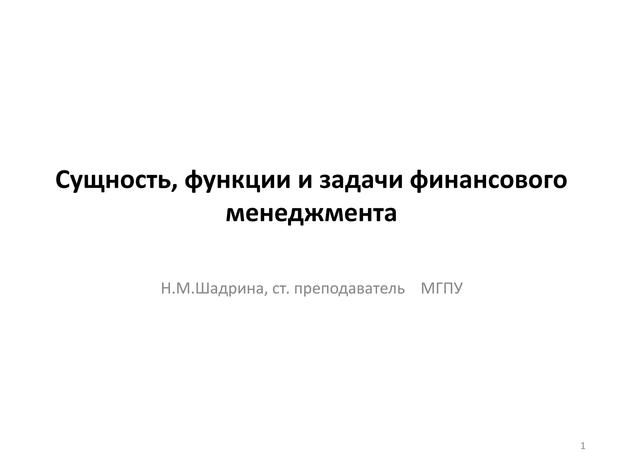 Документ описывает сущность, функции и задачи финансового менеджмента, включая его стратегические и тактические аспекты. Основные функции управления включают целеполагание, планирование, организацию, координацию, делегирование, мотивацию и контроль. В документе также упоминаются ключевые фигуры в области финансового менеджмента, такие как Гарри Марковиц и Франко Модильяни.