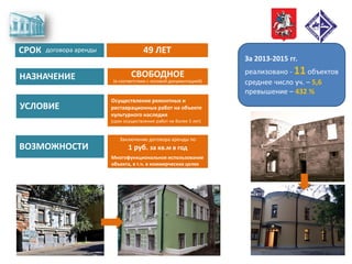 Документ описывает процесс аренды и продажи объектов культурного наследия в Москве, включая информацию о сроках, условиях и размерах арендной платы. В период 2013-2015 гг. был реализован 11 объектов, выставленных на аукцион с начальной ценой аренды от 1 рубля за кв. м. Также указаны характеристики зданий, такие как площадь, этажность, год постройки и процент износа.