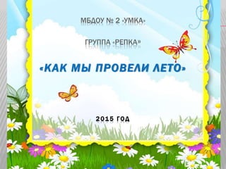 Документ описывает деятельность детской группы 'Репка' в МБДОУ №2 'Умка' за лето 2015 года. В нем упоминаются творческие мастерские, сюжетно-ролевые игры, а также различные занятия с детьми, включая подготовку к конкурсу чтецов. Также документ затрагивает взаимодействие с родителями и прощание с летом.